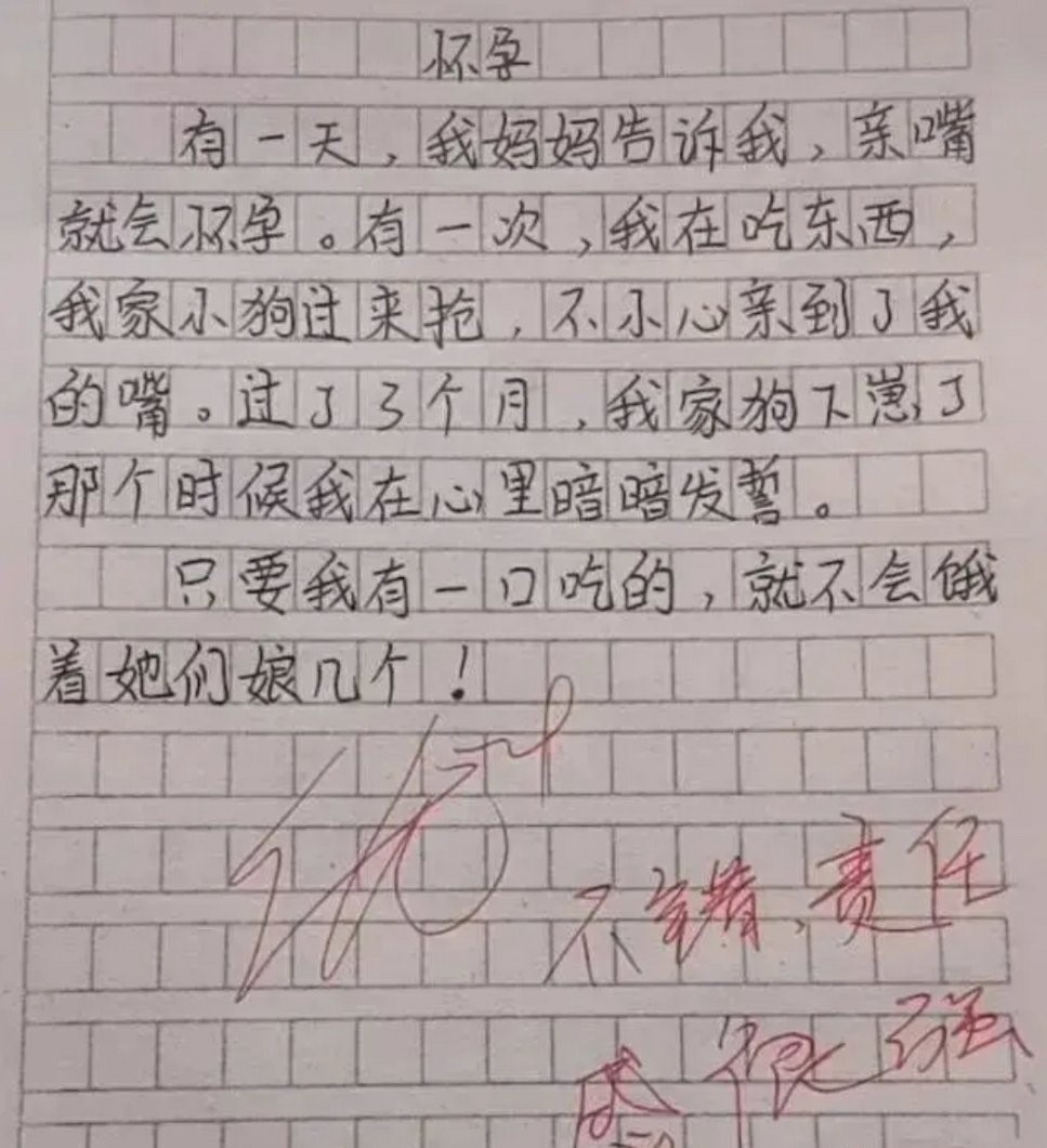 这个小同学小时候,他妈妈告诉他,用她自己的嘴唇可以怀孕,但她相信这是真的。小狗吃东西的时候,过来抓东西,不小心吻了他的嘴。没想到,几个月后,小狗竟然生了小狗。
