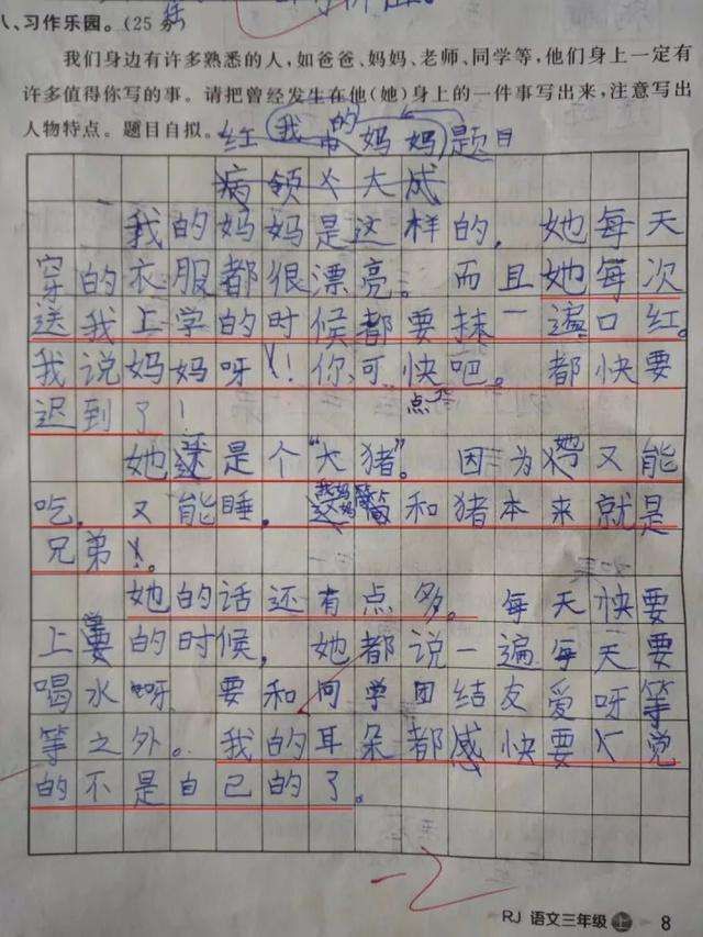 上述小学生应要求在考场写了一篇题为“我妈妈”的作文。小学生写这篇作文很真实,表达了自己的真实感受,但把妈妈比作“大猪”显然不妥,是对妈妈的丑陋表达。我在整个故事中都责怪我的母亲,忘记了我母亲对他的所有善意。